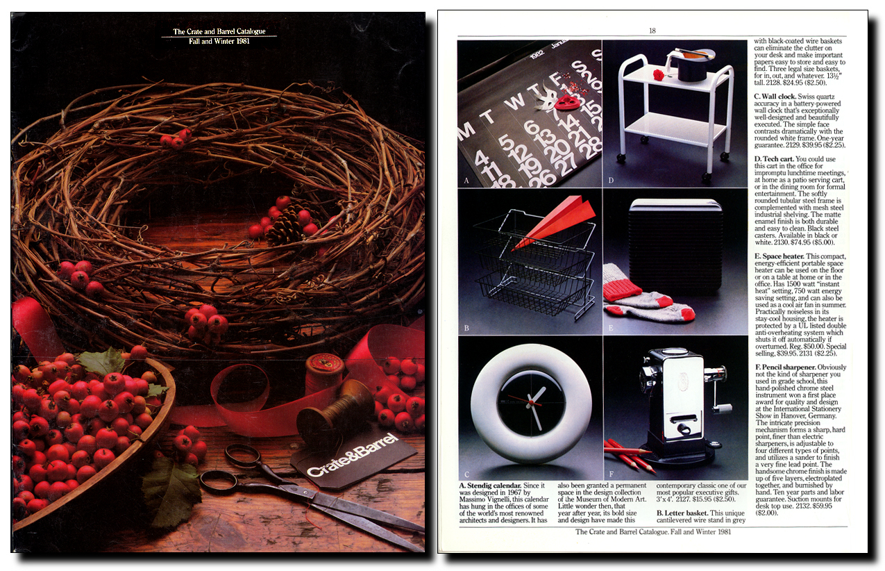 Left: The Crate & Barrel Catalogue cover from Fall and Winter 1981. Right: A product page from the same issue.